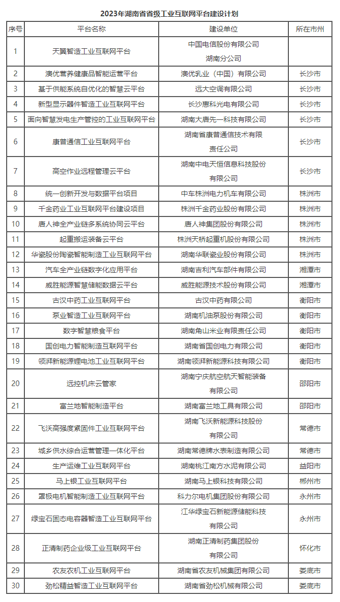 為深入開展“智賦萬企”行動,持續(xù)建設(shè)省級工業(yè)互聯(lián)網(wǎng)平臺體系,加快企業(yè)數(shù)字化轉(zhuǎn)型,打造國家重要先進(jìn)制造業(yè)高地,經(jīng)企業(yè)申報(bào)、市州推薦、現(xiàn)場答辯、專家評審等程序,省工信廳同意天翼智造工業(yè)互聯(lián)網(wǎng)平臺等30個項(xiàng)目列入2023年湖南省省級工業(yè)互聯(lián)網(wǎng)平臺建設(shè)計(jì)劃,現(xiàn)予發(fā)布。