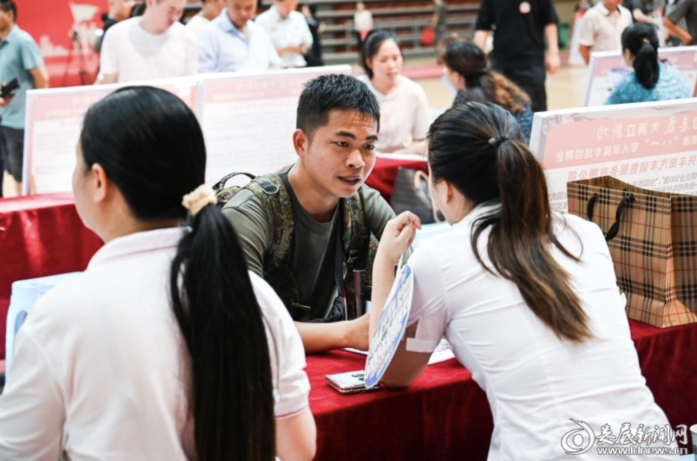 (退役軍人在招聘現(xiàn)場向企業(yè)咨詢工作崗位)